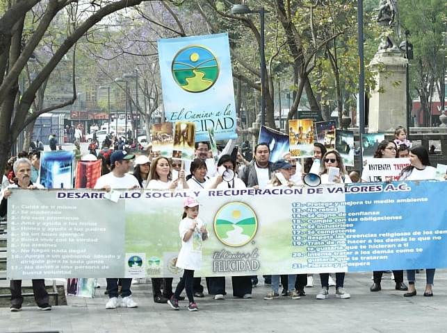 Ciudad de México. - Integrantes de la organización Desarrollo Social y Recuperación de Valores A.C., liderados por Rosalba Fosado Cortés, Presidenta de este movimiento, realizaron una marcha pacífica sobre circuito de la Alameda Central, para promover y concientizar a los transeúntes los valores en esta sociedad.
